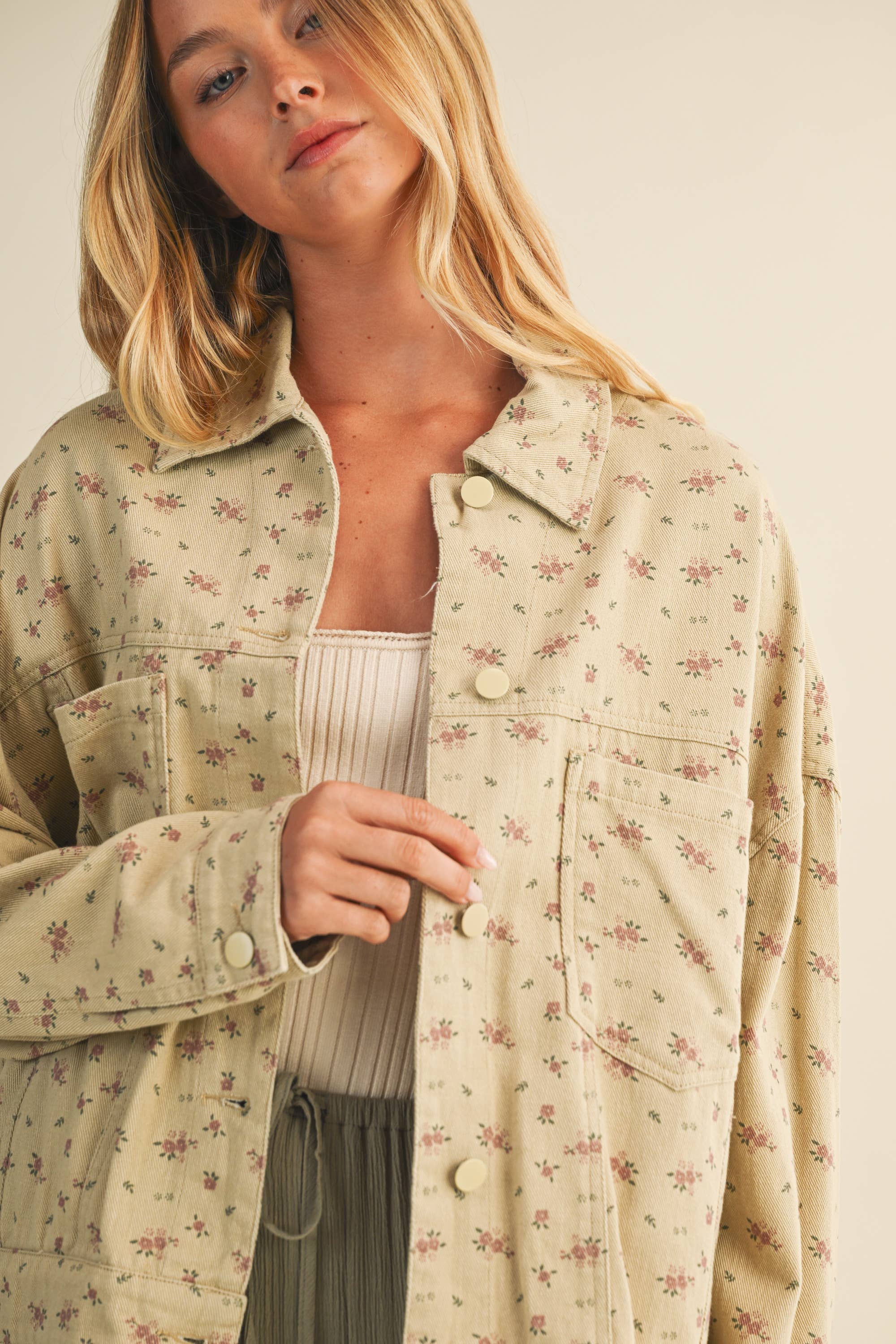 This oversized ditsy floral print jacket is perfect for transitioning into warmer days and cooler nights. Its unlined, perfect for layering. Cute back tuck for added detail.