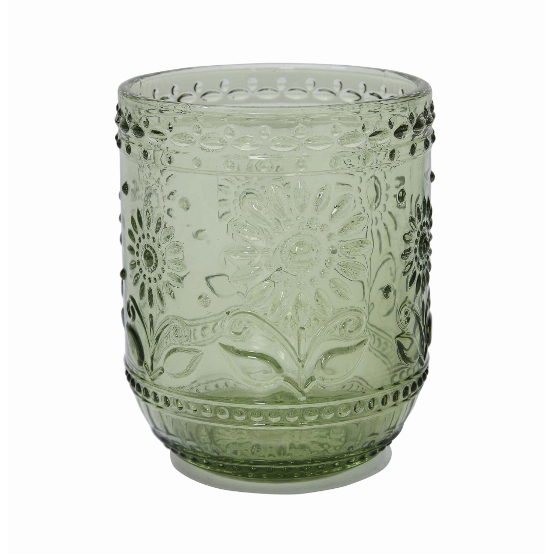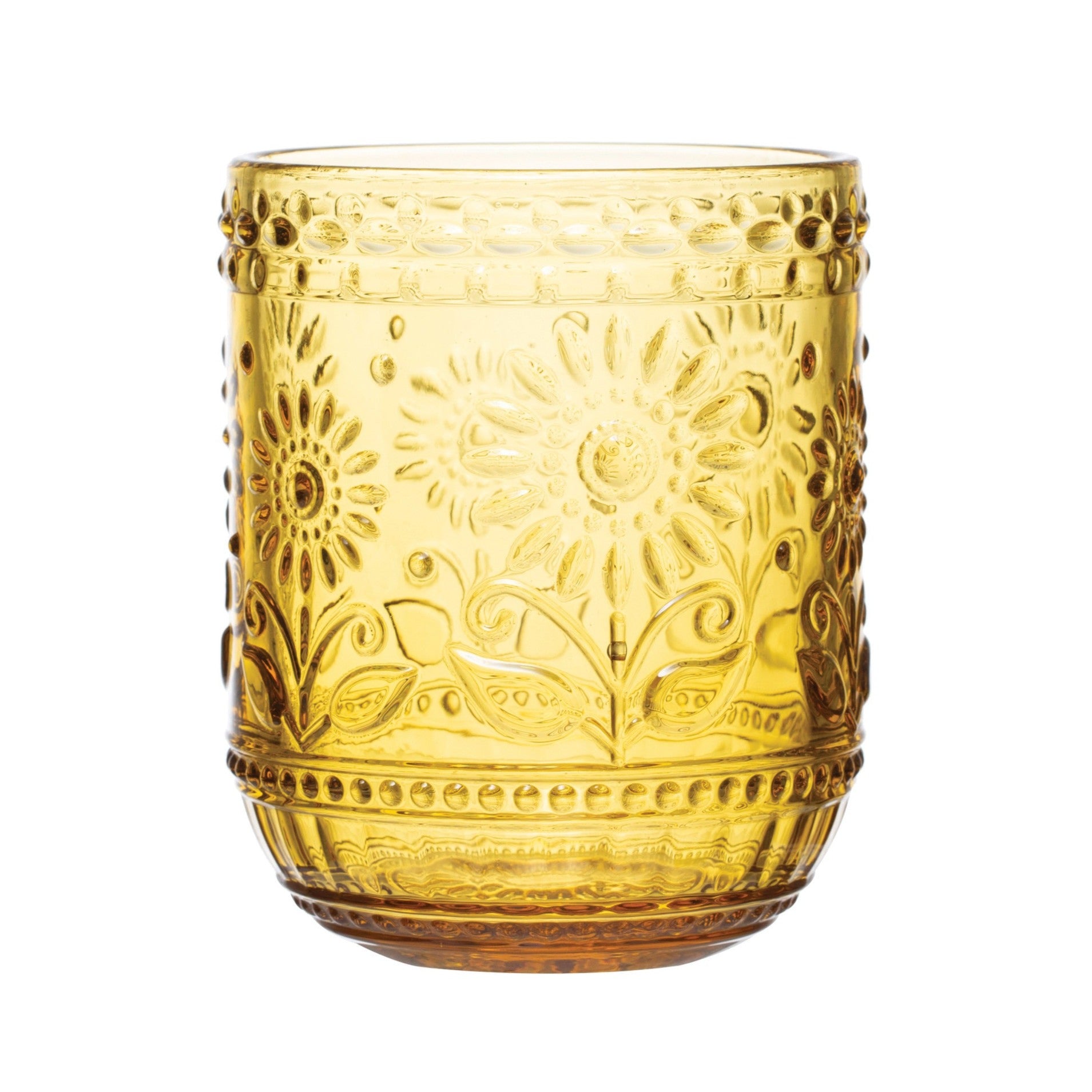 This drinking glass brings both style and class to any gathering. With beautiful detailing, this embossed glass features a bold amber color that effortlessly catches the eye. Whether for enjoying a nice cocktail with friends, or as a glass for a meal with family, this stylish glass is a must-have.