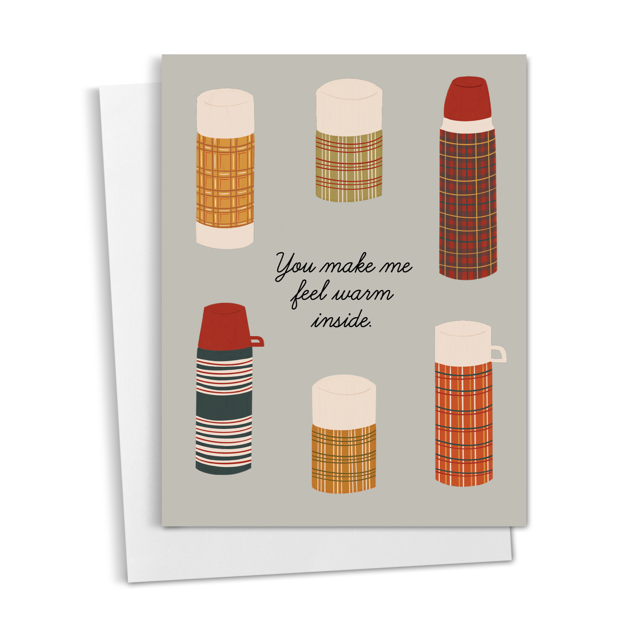 An A2 greeting card featuring a hand illustrated vintage thermoses and the words "You make me feel warm inside." Inside is blank for your custom message.